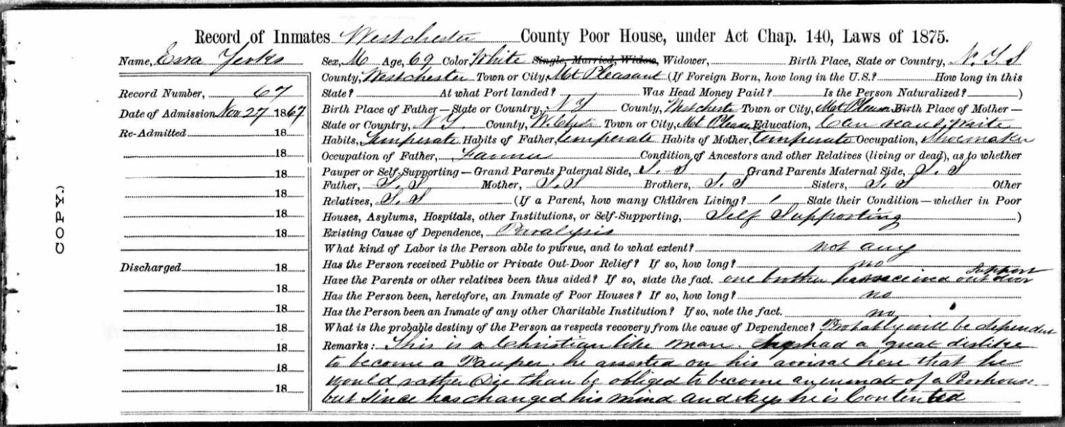 There are several James Yerks born around the same time. They are: James Yerks BIRTH 16 AUG 1823 • Ossining, Westchester, New York, United StatesDEATH 9 OCT 1880 • Chappaqua, Westchester, New York, United StatesThis James died in the Civil War and is buried at the old Saint Mark's Cemetery in Mount Kisco (Next to