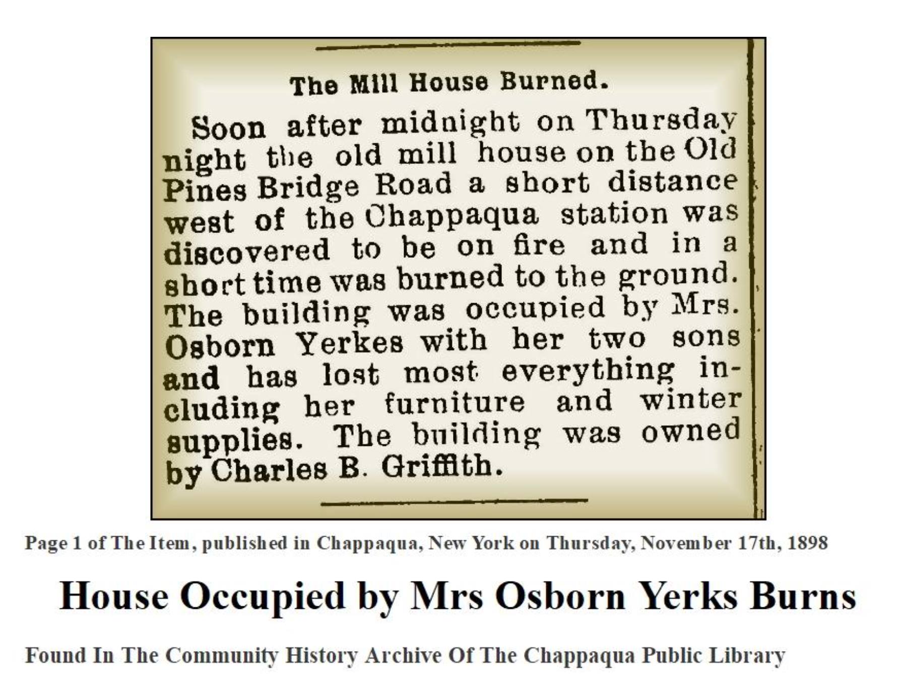 By Philip HayesPublished On: December 13th, 2020Categories: Places: Chappaqua, Surname: Yerks, Walking In The Footsteps of Our AncestorsOn May 6, 1897, the local Chappaqua newspaper reported that Mrs. Osborn Yerks (Melissa Campbell) had moved into the Gabrielle Greeley Clendenin "hillside house." Gabrielle is the daughter of Horace Greeley, the well-known publisher of the Tribune Newspaper. Mrs. Clendenin was well-known for her charity and generosity. With this being just two years after the