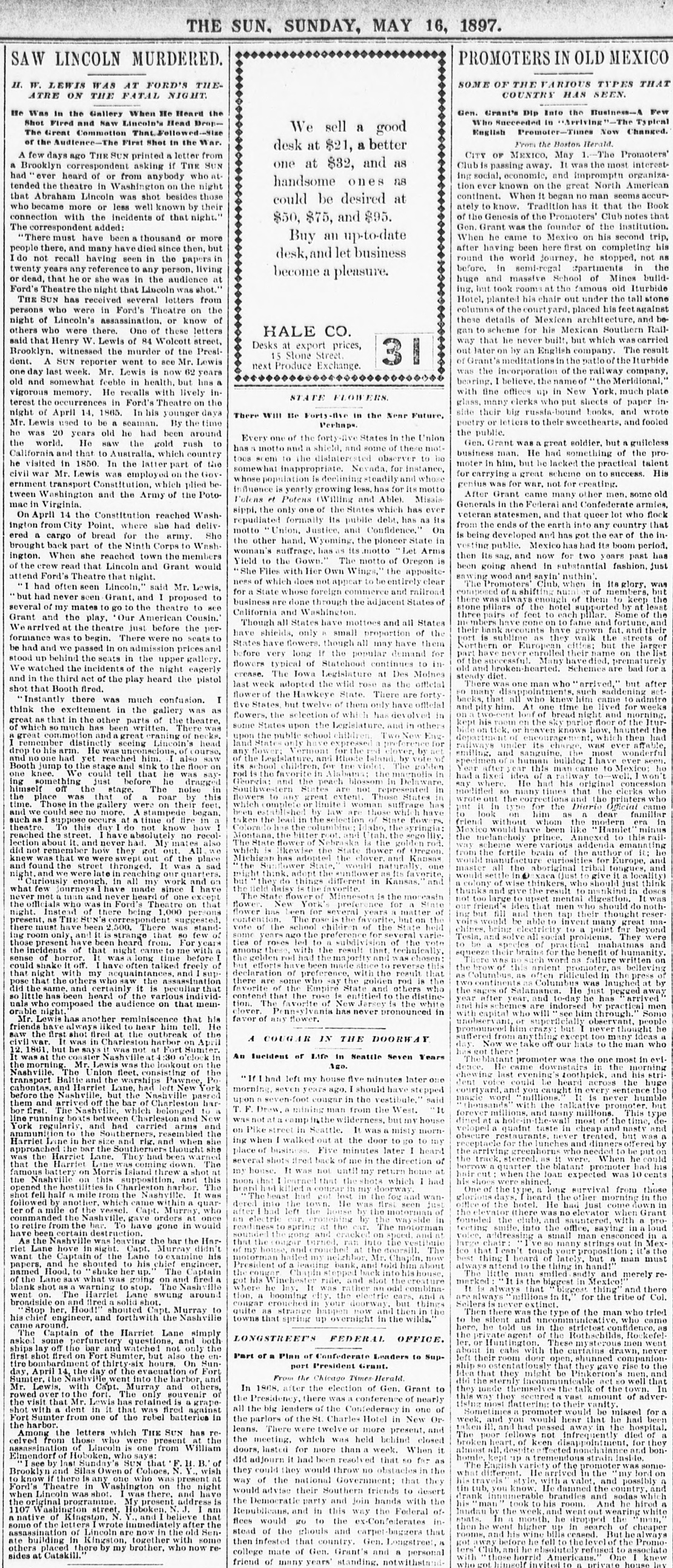 On Sunday, May 19, 1897, the published an article titled “Saw Lincoln Shot”. In it, was an interview of Henry William Lewis, age 62, and the great, great grandfather of Philip Hayes Sr. Henry Lewis told The Sun the reporter of two very interesting stories related to the civil war. Below is a copy of